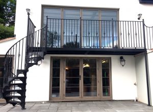 Cast Iron spiral stair and balcony with basket & double twist balusters front view